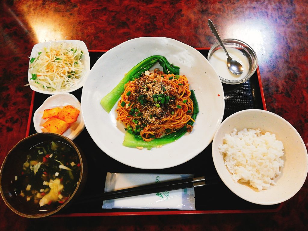5分ほどで料理は到着。汁無担々麺の他に、サラダ、ライス、スープ、キムチ、杏仁豆腐が付いていました。