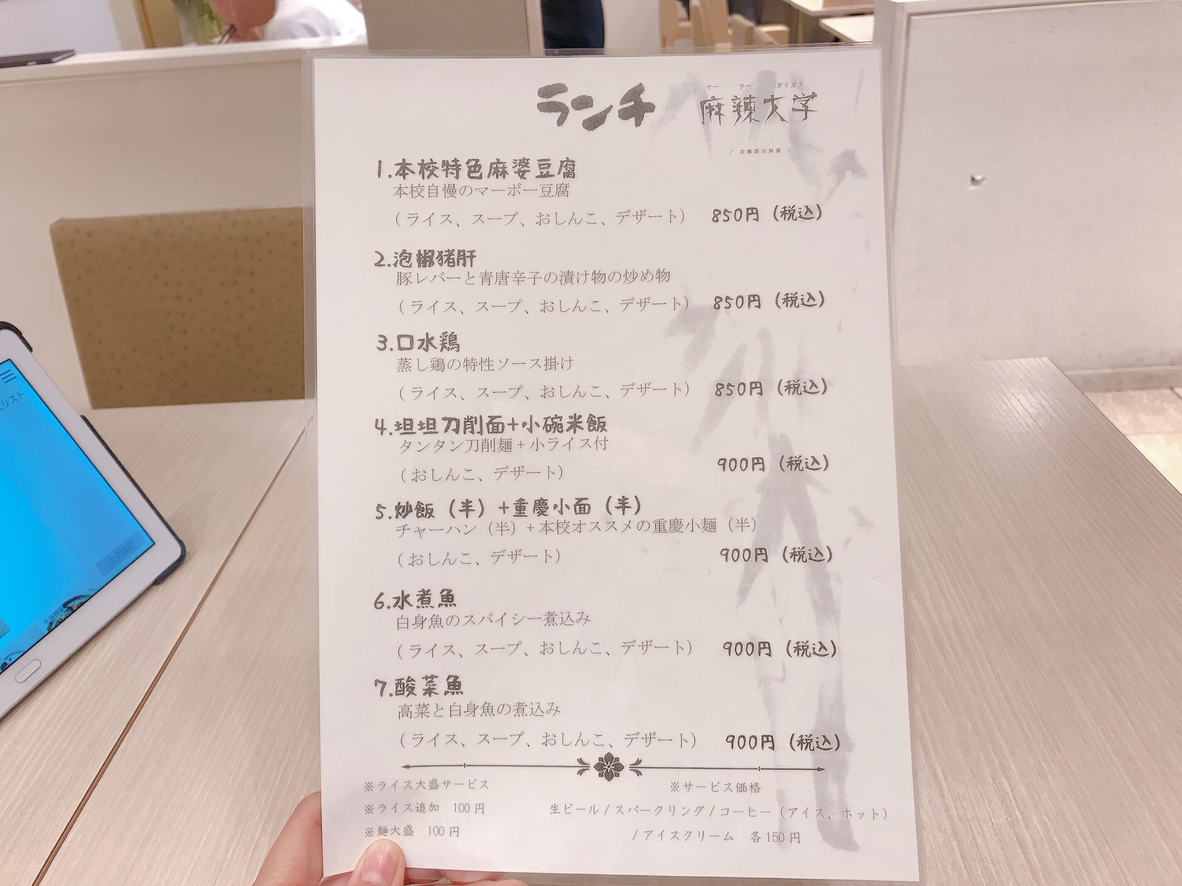 本校自慢の麻婆豆腐をはじめとした7つのメニューが並びます。いずれも850~900円というのが素晴らしいコスパの良さ。