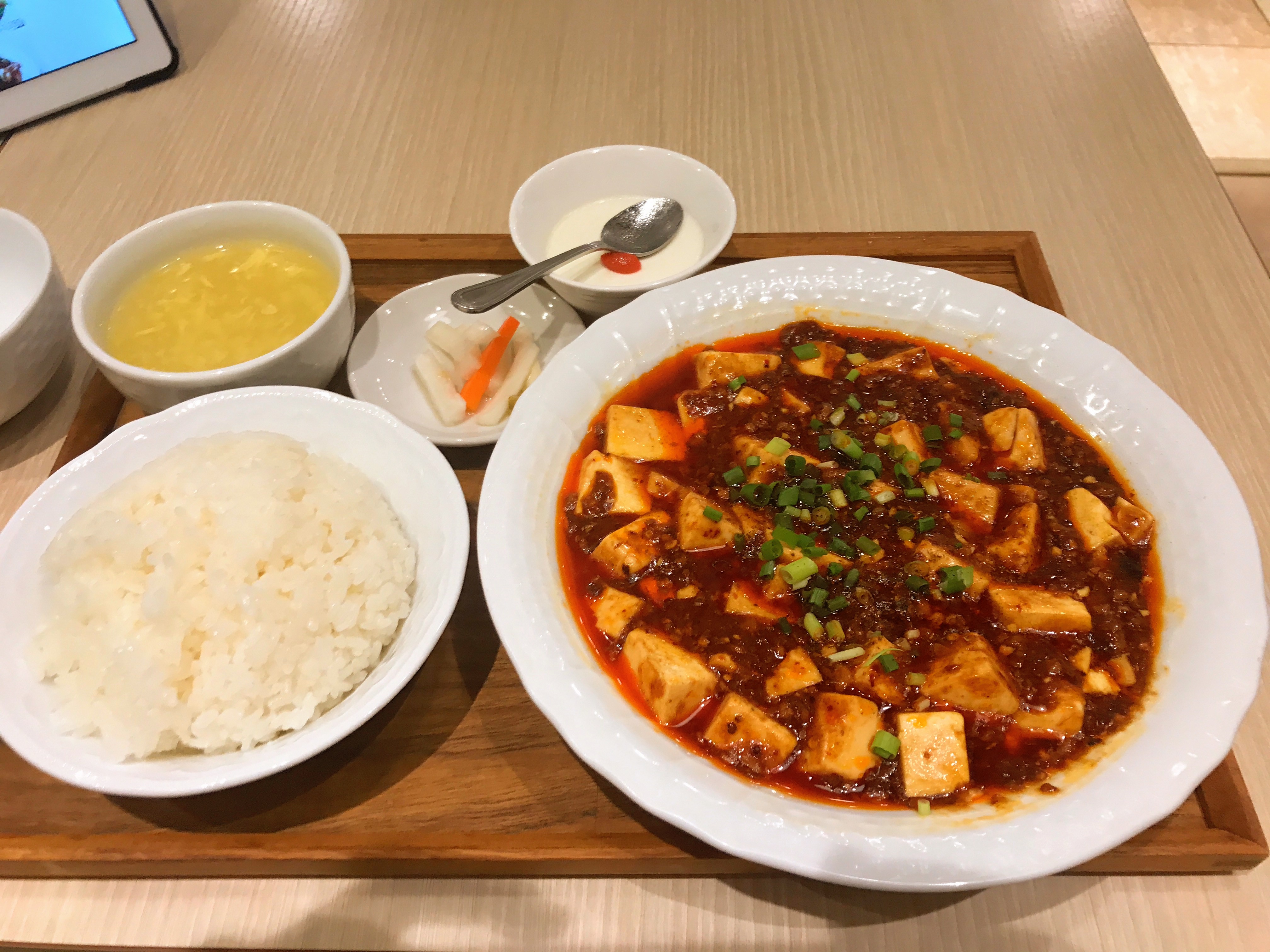 マーボー豆腐、ご飯、スープ、お漬物、デザートの杏仁豆腐で850円。